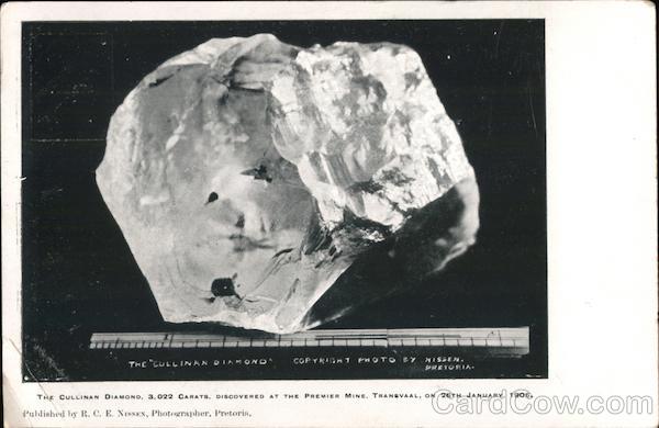 THE "CULLINAN DIAMOND' WE COPYRIGHT FHOTO 27 NISSEN. PRETORIA. THE CULLINAN DIAMOND, 3,022 CARATS, DISCOVERED AT THE PREMIER MINE, TRANSVAAL, ON 26TH JANUARY, 1905. Published by R. C. E. NISSEN, Photographer, Pretoria.