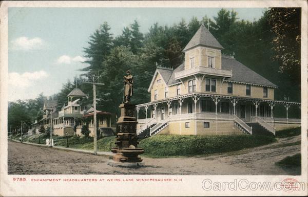 Front: 9785. ENCAMPMENT HEADQUARTERS AT WEIRS LAKE WINNIPESAUKEE. N. H. EE I 訂 COPYRIGHT 1906. BY DETROIT PUBLISHING CO Back: AND CANADA. FOREIGN. TWO CENTS