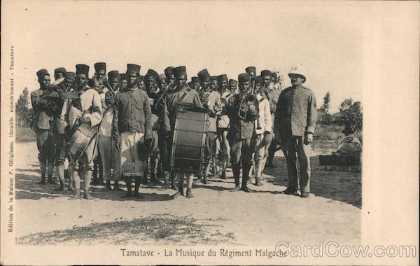 Front: Tamatave La Musique du Régiment Malgache Edition de la Maison P. Ghigiasso, librairie ameublement Tamatave Back: Tous les Pays étrangers n'acceptent pas la Correspondance au recto. - Se renseigner à la Poste