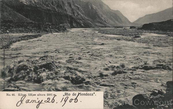 Front: No. 46. Kilom. 122,500 altura 2091 m. „Rio de Mendoza“. Jamy26.190b. Editor Augi to Streich, Mendoza Back: Carte postale. Union postale universelle. Franqueo Interior 4 c. Exterior 6 c.