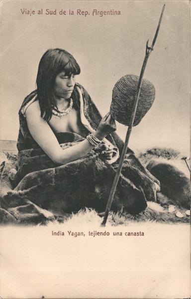Front: Viaje al Sud de la Rep. Argentina India Yagan, tejiendo una canasta Back: Franqueo Interior 4c. Exterior 6 c. Tarjeta postal. Carte postale. Union postale universelle. 483 Editor R. Rosauer, Rivadavia 571. Bs. Aires. Neg. S. F. A. de Afdos,