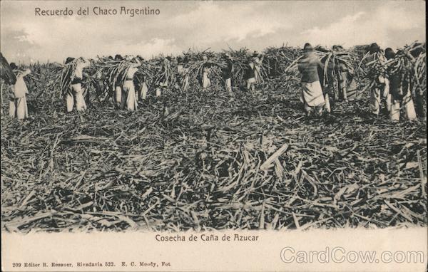 Front: Recuerdo del Chaco Argentino Cosecha de Caña de Azucar 209 Editor R. Resauer, Rivadavia 522. E. C. Moody, Fot. Back: Tarjeta postal. Carte postale. Union postale universelle. Franqueo Interior 4 c. Exterior 6 c.