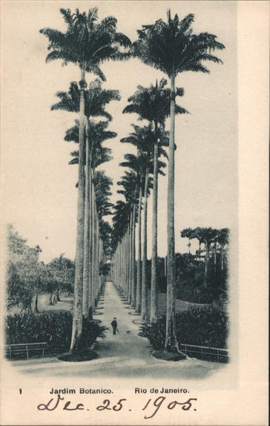 Front: Jardim Botanico. Rio de Janeiro. Dee.25.19os. Back: BILHETE POSTAL DO BRASIL Neste lado só o endereço A. RIBEIRO, FABRICANTE-RUA SENADOR ALENCAR, 25-RIO DE JANEIRO.)