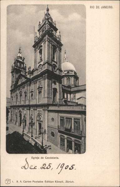 Front: RIO DE JANEIRO. Egreja da Candelaria. See 25, 1905. PVK 1. S. A. Cartes Postales Edition Künzli, Zürich. Back: Bilhete Postal. Este lado está exclusivamente reservado para o enderrço.