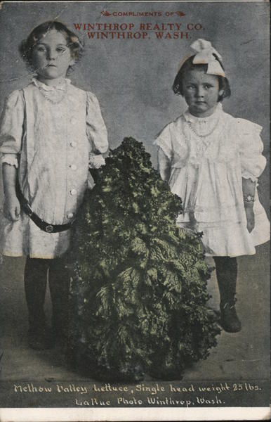 Front: COMPLIMENTS OF WINTHROP REALTY CO. WINTHROP, WASH. Methow Valley hettuce, Single head weight 23 lbs. LaRue Photo Winthrop, Wash. Back: OKANOETAN DOMESTIC 1c FOREIGN 2C