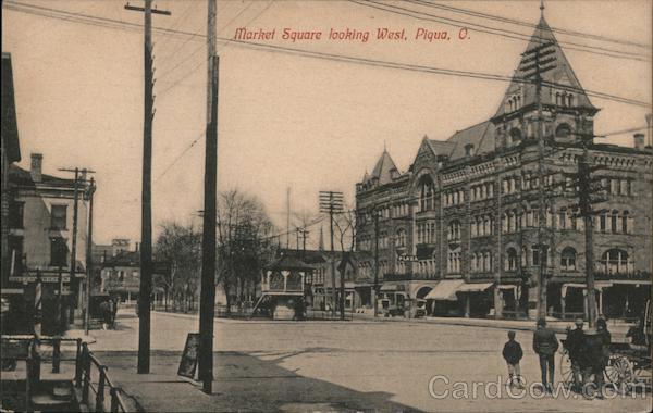 Front: TOT KAT WIDIE ELECRAPI HE MOUSE Market Square looking West, Piqua, O. PLAZA EFE 11 HEK tubi Back: Published by Geo. Benkert & Co., Piqua, O. 7131 POST NN CARD. 508 The Address to be written here