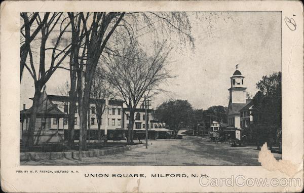 Front: PUB. BY W. F. FRENCH, MILFORD N. H. UNION SQUARE, MILFORD, N. H. B. Back: post care JUL2T 8 AM 1906 SEMIES 1902 UNITED STATES OF 1706 FRANKLIN 1790 Go Miss Mary Heanne While's Point, TT Iloncester, Mass. ليه