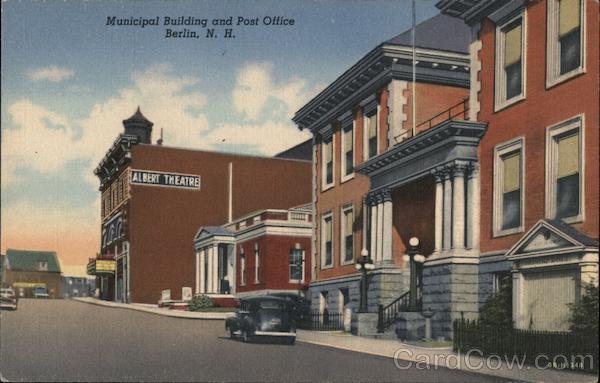 Front: Municipal Building and Post Office Berlin, N. H. ALBERT THEATRE 8B-H1348 Back: THE BISBEE PRESS, LANCASTER, N. H. "C.T.ART-COLORTONE REG. U.S. PAT. OFF.
