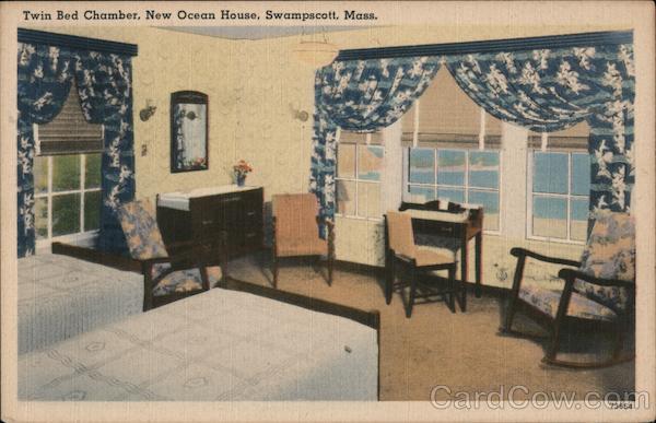 Front: Twin Bed Chamber, New Ocean House, Swampscott, Mass. 73654 Back: MADE IN U, S. A 2,50 TICHNOR QUALITY VIEWS" REG. U.S. PAT, OFF. MADE ONLY BY TICHNOR BROS., INC., BOSTON, MASS.