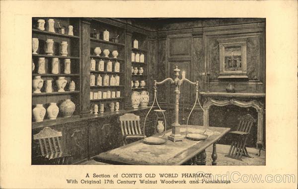 | With original 17th century walnut woodwork and furnishings, this original Florentine Pharmacy dates from 1624 and is the property of Conti Products Corp., makers of the famous Conti Castile Soap, Conti Castile Shampoo and Conti Cream. It is on exhibition in the Hall of Pharmacy at the New York World's Fair and contains one of the finest collections of antique pharmacy jars in existence. |
