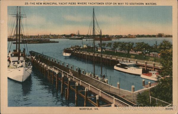 Front: 25:-THE NEW MUNICIPAL YACHT PIERS WHERE YACHTSMEN STOP ON WAY TO SOUTHERN WATERS. NORFOLK. VA. 46196 Back: - STAMP PUBLISHED BY FRANK G. ENNIS PAPER CO., NORFOLK, VA Tow Zone