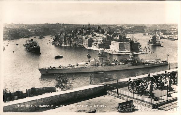 Front: THE GRAND HARBOUR SENGLEA POINT- MALTA. BESSERY k Back: Copyright: THE A.B.C. PHOTOGRAPHIC DEPT. South Street, Valletta. SENDING YOU GREETINGS Valentine's THIS IS A REAL PHOTOGRAPH GT. BRITAIN FOR ADDRESS ONLY