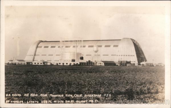 Front: U.S. NAVAL AIR BASE, NEAR MOUNTAIN VIEW, CALIE. DIMENSIONS 954. OF HANGAR LENGTH 1138 FT. WIDTH 310 FT HEIGHT: 146 FT. Back: Oz SEDA P₁