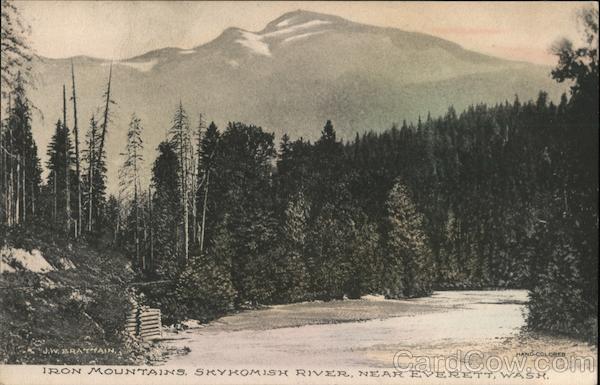 Front: J.W. BRATTAIN, HAND-COLORED IRON MOUNTAINS, SKYROMISH RIVER, NEAR EVERETT, WASH. Back: This space is for the Domestic 1 Ct. Foreign 2 Cts. THE ALBERT PE GO./ BROOKLYN, N.Y.