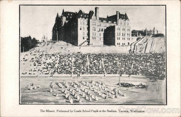 Front: ** ** ** *** KA 47 11 1 $44 111 II II 7:40*** 04 The Minuet, Performed by Grade School Pupils at the Stadium, Tacoma, Washington Back: 4 benzd of Published by Central News Co., 935 C Street POST CARD