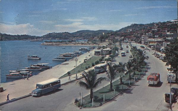 TARJETA POSTAL "Plastichrome" E.U.A. P3619 Ammex Asociados, S.A., Apartado 274, Mexico, D.F. Calzada Costera Miguel Alemán, Acapulco, Gro. Boulevard Miguel Aleman and the Malecon, where the fishing boats dock.