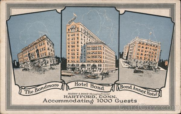BONDMORE OF GEG EHE WATERF HOTEL BOND The Bondmore 12 73 1.03 TERRE tu 4339 SENE 9666 Hotel Bond HARRY S. BOND Managing Director HARTFORD, CONN. Accommodating 1000 Guests & BEZE ET FLUMIL 253 Bond Annex Hotel wwwwwww