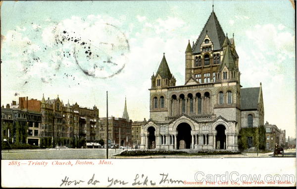 Front: 2885-Trinity Church, Boston, Mass. How do you Like Them Souvenir Post Card Co., New York and Berlin. Back: NIMAS LYNNIN DEC 3 9 AM 1906 Miss Hazal 7. Fisher of 20 Pron St. FORFRANKY Cliftondale mass SANTES OF TAGE