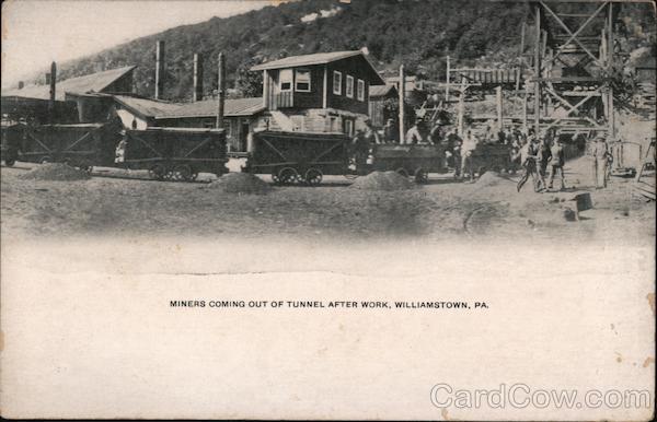 Front: MINERS COMING OUT OF TUNNEL AFTER WORK, WILLIAMSTOWN, PA. Back: 7368 Published by Blanning's Corner Store. G.V. MILLAR & CO 1/0\/49 SCRANTON, PA VIG FOR ADDRESS ONLY.