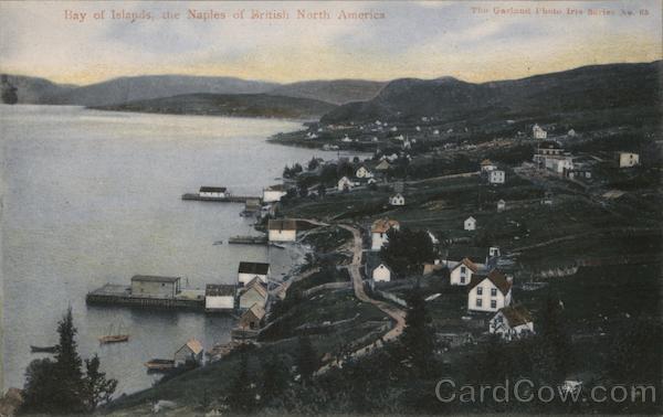 Front: Bay of Islands, the Naples of British North America The Garland Photo Iris Series No. 65 B Back: Write Here. PICTURE POST CARD. For British, Colonial and Local Use only. This Space may now be used for Correspondence. Stamp. J7 90384