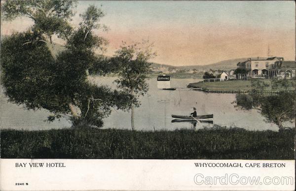 Front: BAY VIEW HOTEL 2246 S BATHING pod HOAZIENDU WHYCOCOMAGH, CAPE BRETON Back: Warwick Bro's & Rutter, Limited, Publishers, Toronto Al TRADE! MARK AND U.S. ABROAD.