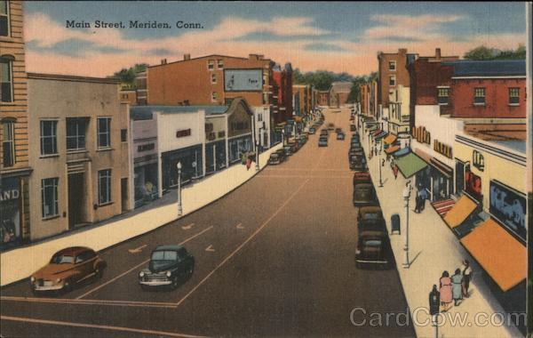 Front: Main Street, Meriden, Conn. EE GE ND Back: MADE IN U.S. A. "TICHNOR QUALITY VIEWS" REG. U. S. PAT. OFF. MADE ONLY BY TICHNOR BROS., INC., BOSTON, MASS. 77938 PUB. BY J. F. MOLLOY, MERIDEN, CONN.