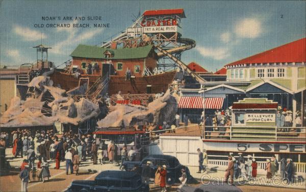Front: NOAH'S ARK AND SLIDE OLD ORCHARD BEACH. MAINE JANTER TRY A REAL RIDE BELLEVUES POPCORN 2. Back: MADE IN U. S. A *TICHNOR QUALITY VIEWS" REG. U.S. PAT, OFF. MADE ONLY BY TICHNOR BROS. INC., BOSTON, MASS, 63974