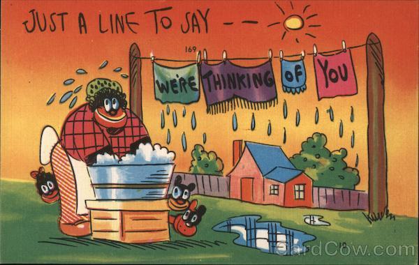 Front Message: Just A Line To SAy -- We're THINKING OF YOU Photo depicting vintage mammy caricature scrubbing clothes in metal bucket atop of wood base. Partial message written in orange sky, and yellow sun "JUST A LINE TO SAY --. Partial message written on clothes pinned to clothesline, "WE'RE THINKING OF YOU" (green; WE'RE, purple; THINKING, blue; OF, red; YOU). Water dripping from wood staked clothes line, orange house with blue roof and wood fence and trees in background. Mammy caricature scrubbing clothes in forefront with three children 'piccaninny art' peaking out behind her. Water puddle underneath clothesline, sweat bursting from mammy caricature's brow. Number: '169' found front, top-center, '10' found front, bottom, right, corner. Art: Early 20th Century African American Folk Art (Mammy Caricature and Piccanninny - children) Colors: orange, yellow, green, purple, blue, red. Objects: Mammy caricature, black children, bucket, pale, Piccaninny, puddle, house, fence, tree, clothesline, sun, cloth hat, plaid shirt, striped skirt, apron. Back Card Blank, no message, no stamp. Publisher: PUB FOR ASHEVILLE POSTS CARD CO., ASHEVILLE, N.C. (left side) Print: a "colourpicture" publication (center) Top text reads: THIS SPACE FOR WRITING MESSAGES. |