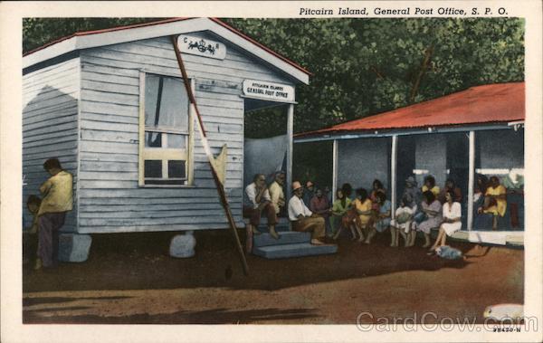 | Front Postcard: Pitcairn Island, General Post Office, S.P.O. Picture: Wood siding building with two step and one window. Sign above steps and walkway reads: Pitcairn Island General Post Office. Sign at top of building near roof reads: British halmark (C, R). People sitting on steps and leaning against outer wall. Pole leaning on wall in front of window. Second building next to post office with three pillars and porch, two doorways, people sitting on porch, dog on ground, trees in background. Colors: brown, green, gray, yellow, brick/red. Item number: Bottom right hand corner: 9B490-N Back of post card is blank no address or hand written message. Back post card, center: Genuine Curteich-Chicago M.C.T. American Art Post Card (Reg. U.S. Pat. Off.) |