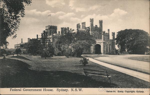 Front: Federal Government House. Sydney. N. S. W. Series 86. Kerry. Copyright. Sydney. Back: Guignon 25 Rue El Manakh Cairo Many Thanks for two Post Carded the one for the stamps bel, Leggett 42 Park Avenue Ashfield 1914 no Yeb 17 Kubwoy uỊ popuļsd
