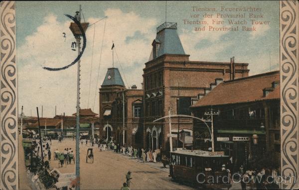 Front: Tientsin, Feuerwächter vor der Provinzial Bank Tientsin, Fire Watch Tower and Provincial Bank 13. Back: Ampume ahm P.E.THO Meguard Mour Herrein quignon ( Sappt Ylivu Alfarokk, Caine Grue. El Manakh te No. 98.