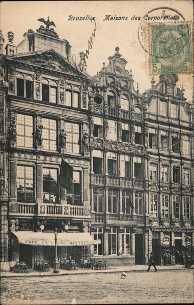 Front: Bruxelles Maisons des Corporations SPOSTES 5. COSTERIDEN 56 BRASSERIEGUSAD HCOOLS yil CAFE L4L UVE RESTAURAN CLGIE Back: POSTKAART Semsen lyu xa MH Gerignon Sussex Road Holloway Sondresch 140 Rue ficleman Lachen Breseller 82 su Belgia