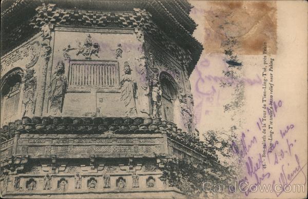 Front: mes on Timbres 45. - Bas-reliefs de la Tour de T'ien-Ling-T'sé, près Pékin T'ien-Ling-T'se tower's basso 1elief near Peking Back: *** Ce côté est exclusivement réservé à l'adresse M? Henri Gunomon en Areme de Palty. Paris xvile Trance,
