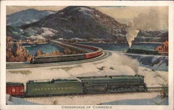 | Crossroads of Commerce- This colorful scene is at the west end of the famed Rockville Bridge, longest and widest stone arch railroad bridge in the world. Here the Pennsylvania Railroad's East-West main line tracks cross the Susquehanna between Rockville and Marysville near Harrisburg, Pennsylvania. |