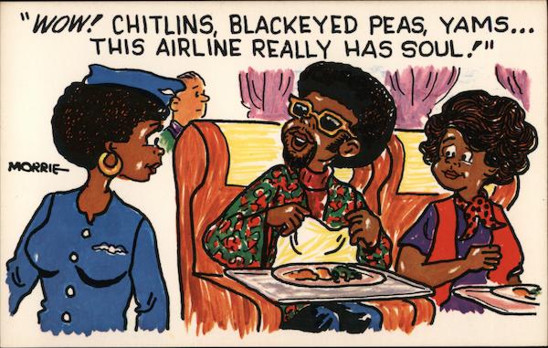 "Wow! Chitlins, blackeyed peas, yams... this airline really has soul!"