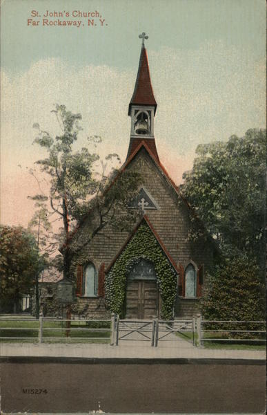 Front: St. John's Church, Far Rockaway, N. Y. M15274 Back: ERT Pust Cawa நீயா LEIPZIG BERLIN NEW YORK Pub. by M. Neveloff, Far Rockaway, N. Y.