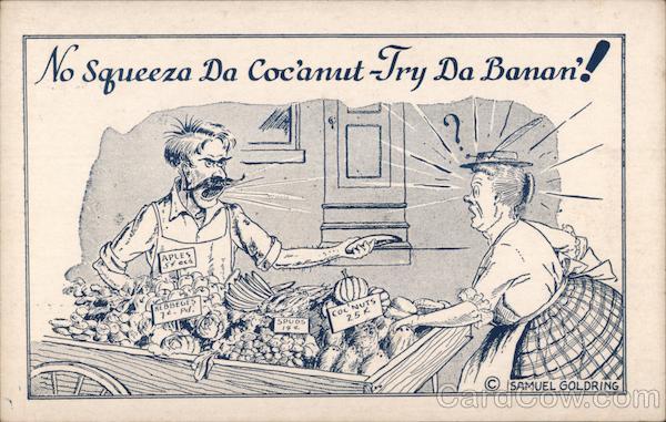 Front: No Squeeza Da Cocanut Try Da Banan! APLES 54 ech KEBBEGES 74- Pd, SPUDS 14¢ Coc'NUTS 25K © SAMUEL GOLDRING Back: THE FUNNYITE CARD CO. 442 N. Vermont Ave. Atlantic City, N. J.
