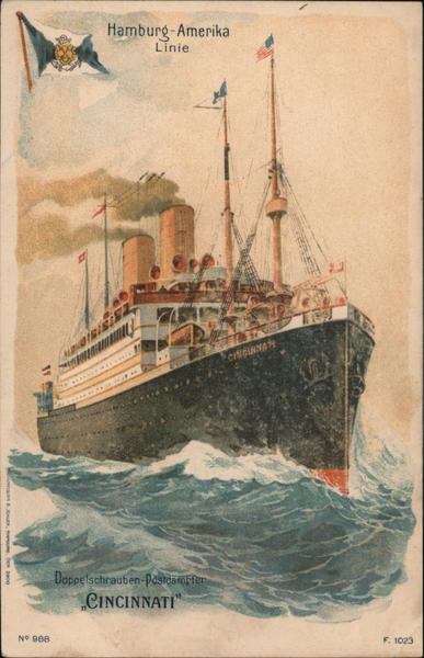Front: Hamburg-Amerika Linie CINCINNATH .. Doppelschrauben-Postdampfer „CINCINNATI" NO 988 F. 1023 MUHLMEISIER & JOHLER, HAMBURG. DER 2800 Back: An Bord des Doppelschrauben-Postdampfers „CINCINNATI" lor den
