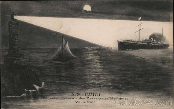 Front: SIELISINA S.S. CHIILI Paquebot Français des Messageries Maritimes Vu de Nuit Back: Kessler Parol adame Marie Souvenir de ma 8 traversée Marseille-Oran 10 et 11 avril 1988 bon fils affection fectioune, gec Kessler, Eils aff