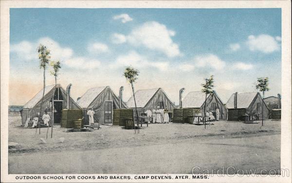 Front: OUTDOOR SCHOOL FOR COOKS AND BAKERS, CAMP DEVENS. AYER. MASS. Back: Mfg. 1 y Tichnor Bros. Inc., Boston, Mass. For Army Y. M. C. A., Camp Deven's, Ayer, Mass. YMCA