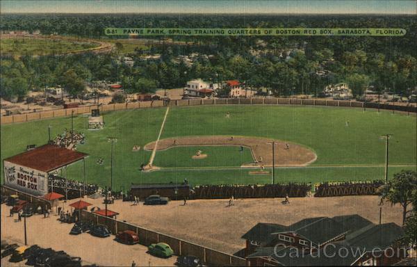Front: S-81 PAYNE PARK, SPRING TRAINING QUARTERS OF BOSTON RED SOX, SARASOTA, FLORIDA PAK RED SOX Homa of BOSTON Back: E-9222 PUBLISHED BY HARTMAN LITHO SALES CO., BOX 697, LARGO, FLORIDA Photo by Lewis-Moore, Sarasota, Florida