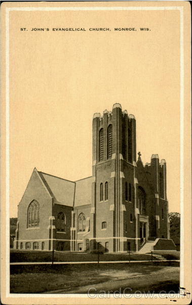 Front: ST. JOHN'S EVANGELICAL CHURCH, MONROE, WIS. Back: M-1127 PLACE C TO ANYWHERE IN US. VIA AIRMAIL Co PUB. BY TRUKENBROD'S PHARMACY, MONROE, WIS. MADE IN U. S. A.