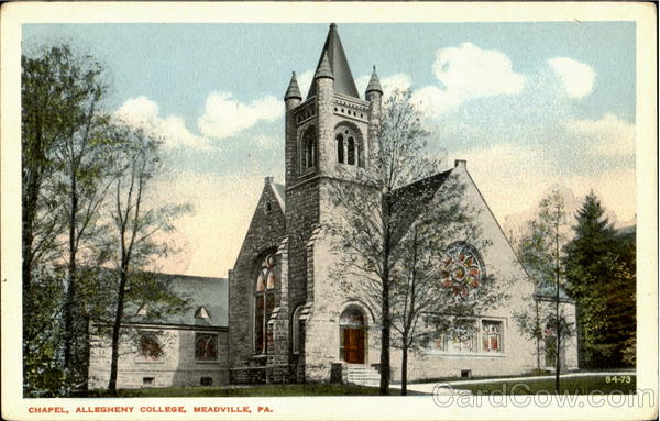 Front: CHAPEL, ALLEGHENY COLLEGE, MEADVILLE, PA. 84-79 Back: PUB. BY HARRY H. HAMM, ERIE, PA. LOCAL VIEWS ERIE PA ECIALTY CRAWFORD 60 THIS SPACE MAY BE USED FOR MESSAGE FOREIGN- TWO CENTS.