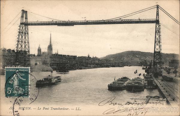 Front: REPUBLIQUE FRANÇAISE 5kF 35 ROUEN. Le Pont Transbordeur. - LL. 16/8/01 POSTES Back: Tous les Pays étrangers n'acceptent pas la Correspondance au recto. (Se renseigner à la Poste). Marsein Raymond Geigne Is rue de Passy Lt