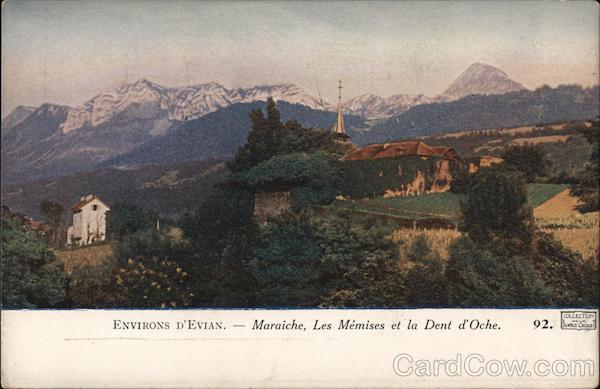 Front: ENVIRONS D'EVIAN. Maraiche, Les Mémises et la Dent d'Oche. COLLECTION 92. SOVRCE CACHAT Back: RÉPUBLIQUE FRANÇAISE (Ce côté est exclusivement réservé à l'adresse) 16