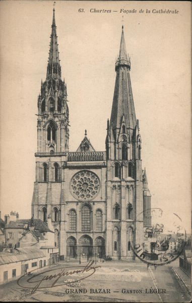 Front: 63. Chartres Façade de la Cathédrale GRAND BAZAR GASTON LEGER Back: CARTE POSTALE ... Certains pays etrangers n'acceptant pas la correspondance de ce coté se renseigner à la Poste A. Bourdier, imp.-édit., Versailles