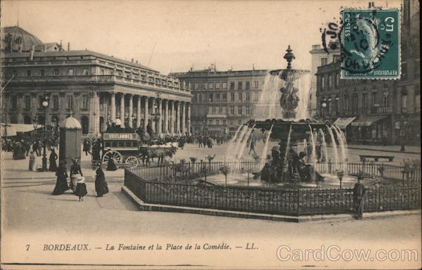 Front: WONS OW REPUBLIQUE ORIFLANME BORDEAUX. -La Fontaine et la Place de la Comédie. - LL. PCSTES Back: M - Gugui Aunties گے 24, rue de Matth. crus 1e)