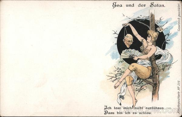 Front: Goa und der Satan. Sch lass mich nicht verführen Dazu bin ich zu schlau. Künstlerpostkarte Nº 215 Gesetzlich geschützt. Back: 30- Levelező-Lap. An in. Wohnung (Straße und Hausnummer)