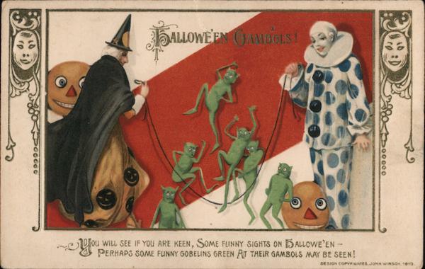 Front: ALLOWE'EN GAMBOLST ou WILL SEE IF YOU ARE KEEN, SOME FLINNY SIGHTS ON BALLCWE'EN PERHAPS SOME FUNNY GOBELINS GREEN AT THEIR GAMBOLS MAY BE SEEN! DESIGN COPYRIGHTED, JOHN WINSCH, 1913. 00000 Back: BBVH POST CARD. ON THIS SIDE.