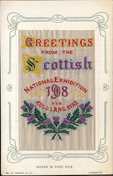 Front: GREETINGS FROM THE Scottish NATIONALEXHIBITION AULD LANG SYNE WOVEN IN PURE SILK. W. H. GRANT & CO. COVENTRY Back: 10. This Space may be used for Communication when for transmission in the British Isles.